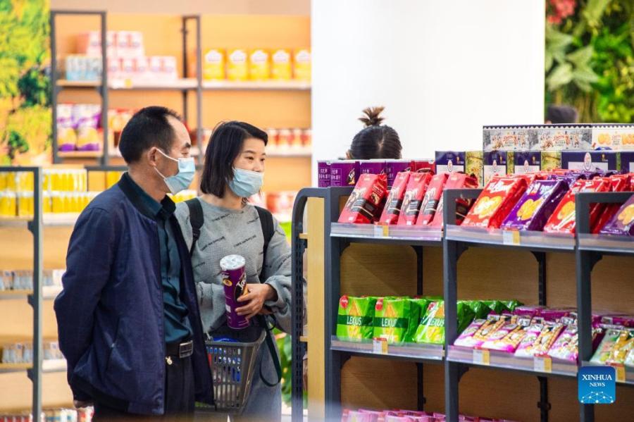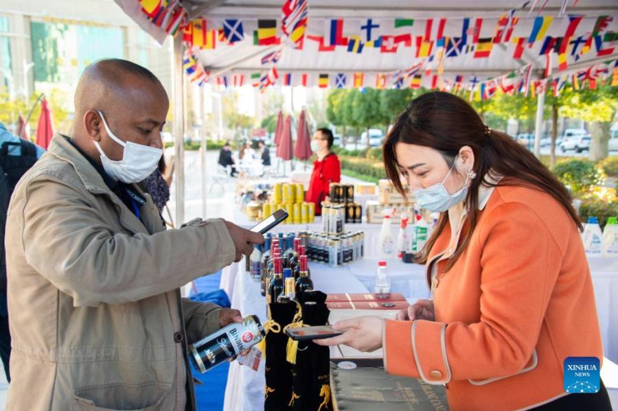 Visitors select imported products during the 2021 Global Digital Trade Conference and Wuhan (Hankoubei) Commodities Fair in Wuhan, capital of central China's Hubei Province, Oct. 12, 2021. (Photo by Wu Zhizun/Xinhua)