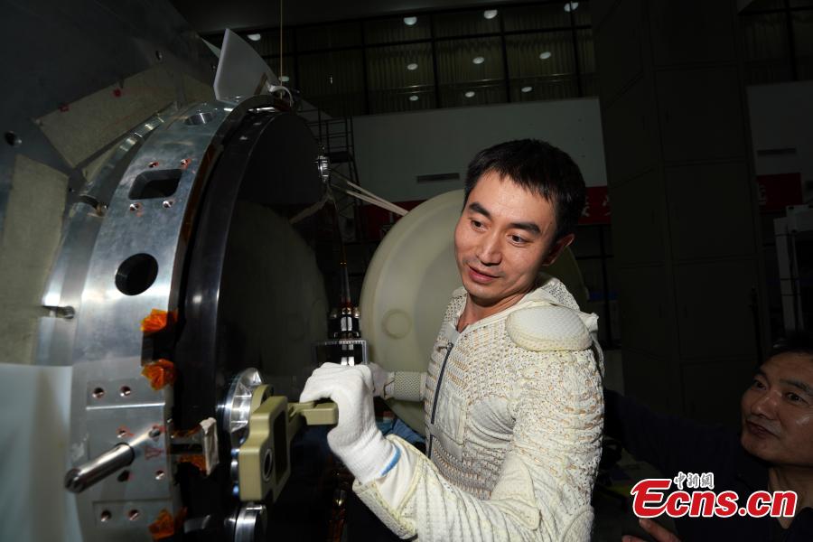 Chinese astronaut Zhai Zhigang takes part in an ergonomic experiment, March 31, 2021. (Photo/Kong Fangzhou)
