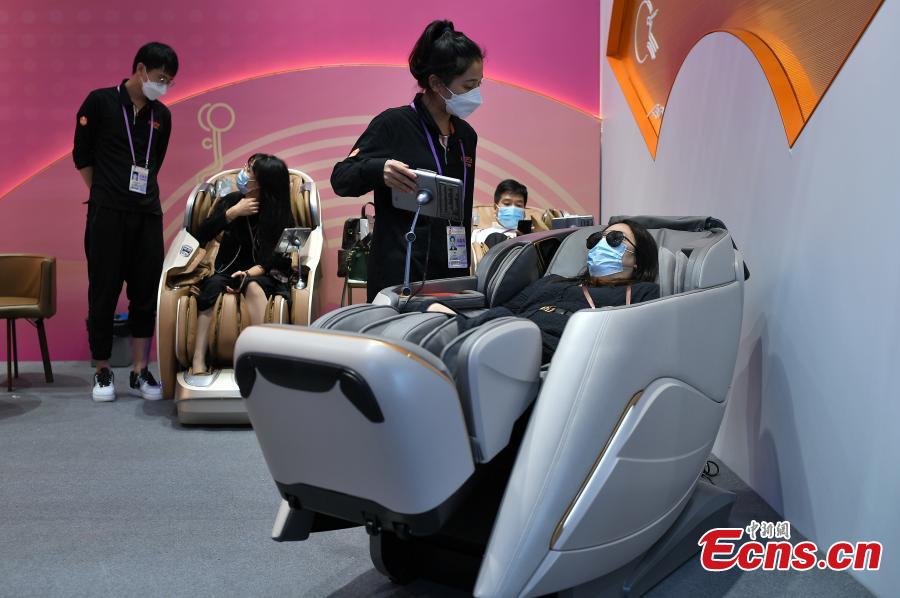 A purchaser experiences the massage chair at the Canton Fair in Guangzhou, capital of south China's Guangdong Province, Oct. 17, 2021. (Photo: China News Service/Chen Chuhong)