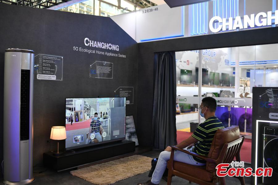 A purchaser experiences a smart home appliance at the Canton Fair in Guangzhou, capital of south China's Guangdong Province, Oct. 17, 2021. (Photo: China News Service/Chen Chuhong)