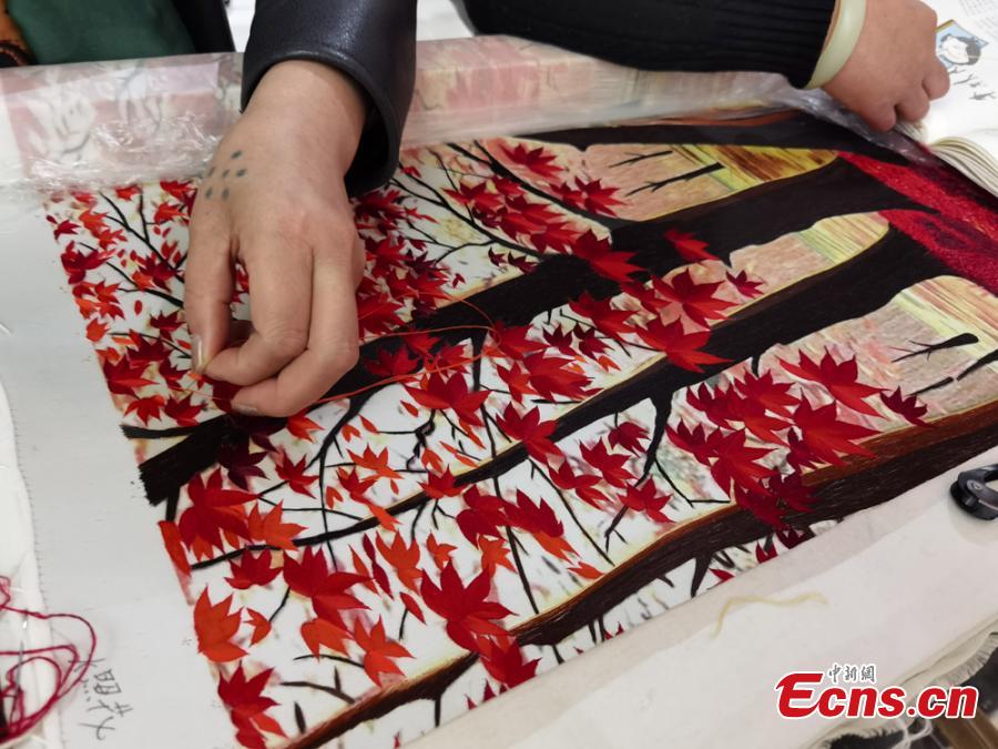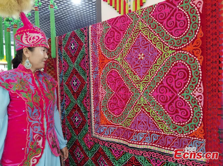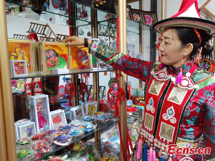 A Yugur craftswoman showcases ethnic embroidery at a local exhibition in Lanzhou, Guasu Province, Oct. 17, 2021.