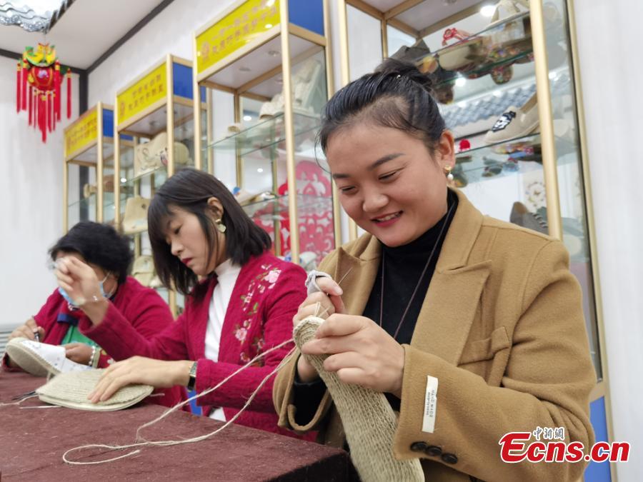 Craftswomen make shoes with hemp ropes at a local exhibition in Lanzhou, Guasu Province, Oct. 17, 2021.