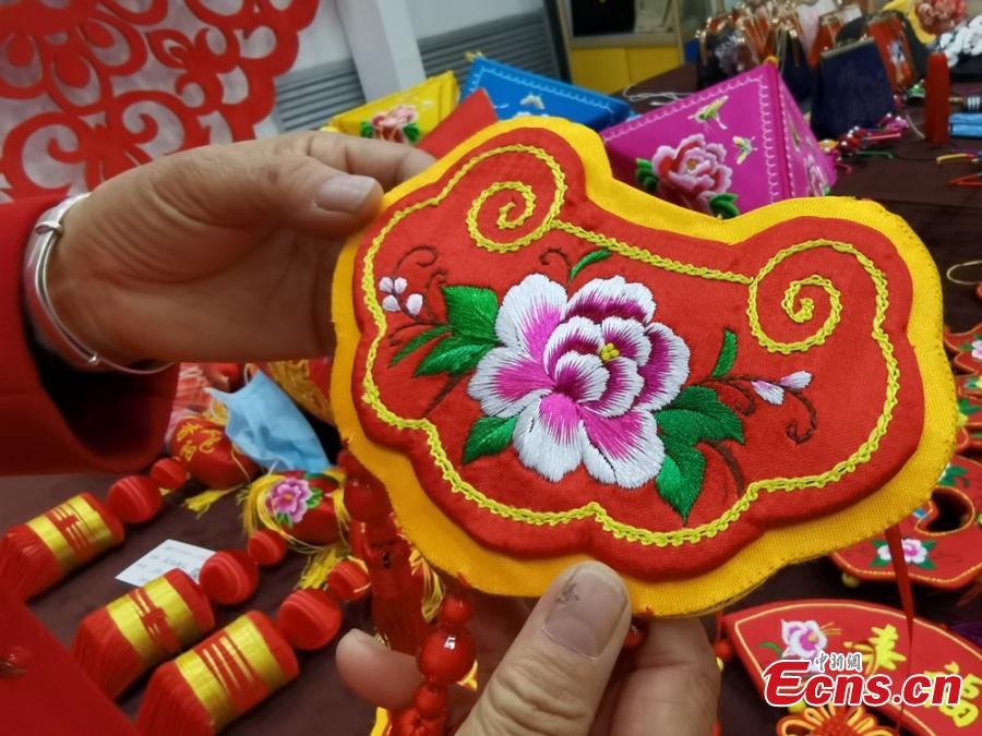 An embroidered sachet from Qingyang is displayed at a local exhibition in Lanzhou, Guasu Province, 2021.