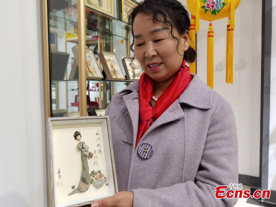 A craftswoman explain handicrafts made from stone at a local exhibition in Lanzhou, Guasu Province, Oct. 17, 2021.