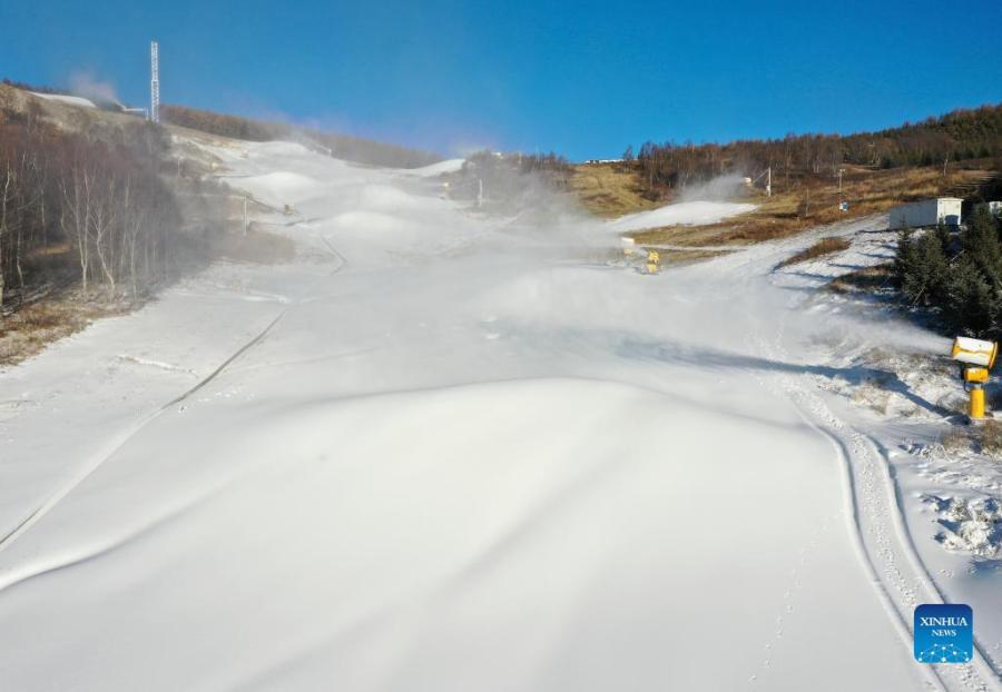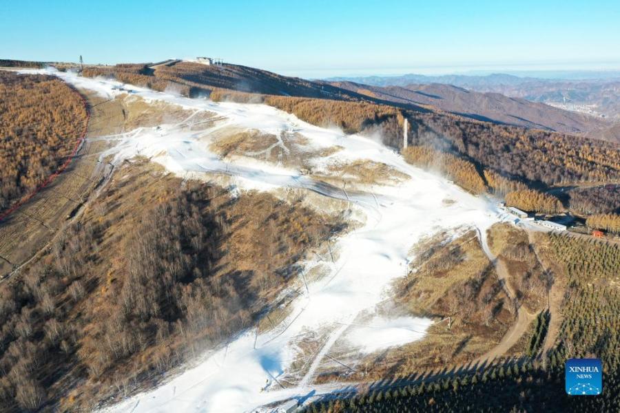 Aerial photo taken on Oct. 19, 2021 shows snowmaking machines working at a ski field in Chongli District of Zhangjiakou City, north China's Hebei Province. Ski fields in Zhangjiakou competition zone have started to make artificial snow in preparation for the upcoming Beijing 2022 Olympic Winter Games. (Xinhua/Wu Diansen)