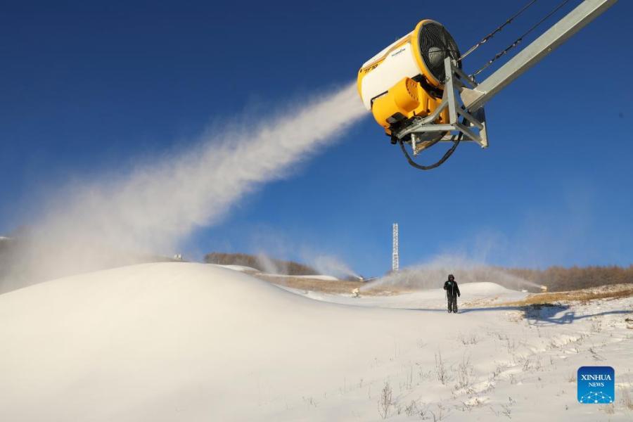A staff member checks the snowmaking machine at a ski field in Chongli District of Zhangjiakou City, north China's Hebei Province, Oct. 19, 2021. Ski fields in Zhangjiakou competition zone have started to make artificial snow in preparation for the upcoming Beijing 2022 Olympic Winter Games. (Xinhua/Wu Diansen)