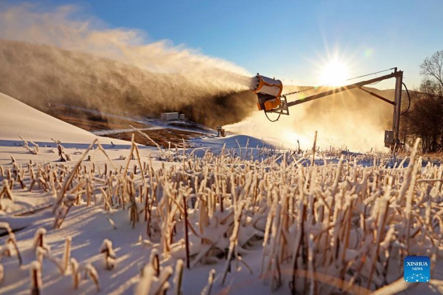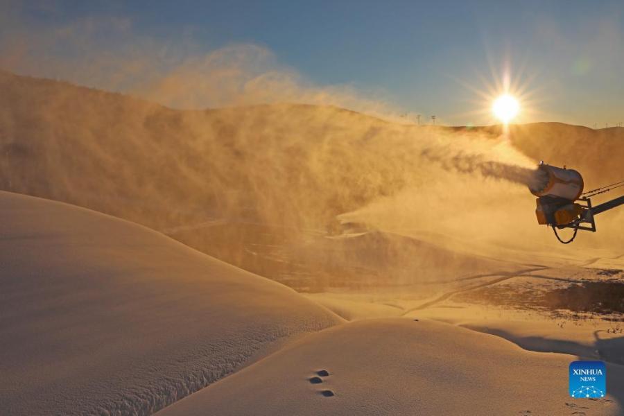 A snowmaking machine works at a ski field in Chongli District of Zhangjiakou City, north China's Hebei Province, Oct. 19, 2021. Ski fields in Zhangjiakou competition zone have started to make artificial snow in preparation for the upcoming Beijing 2022 Olympic Winter Games. (Xinhua/Wu Diansen)