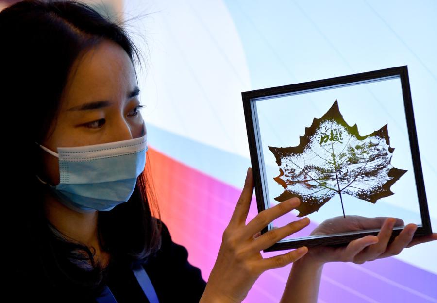 A leaf carving made by laser at the main venue of the 2021 National Mass Innovation and Entrepreneurship Week. (Photo/Xinhua)