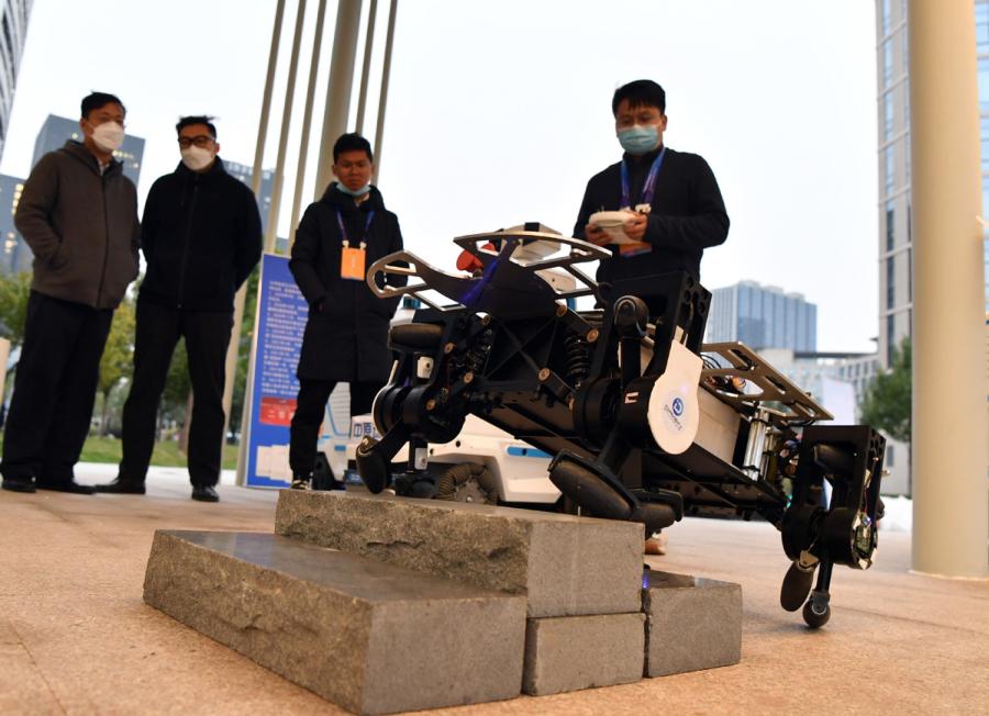 A man controls a robot at the main venue of the 2021 National Mass Innovation and Entrepreneurship Week in Zhengzhou, Henan province on Oct 19, 2021. (Photo/Xinhua)