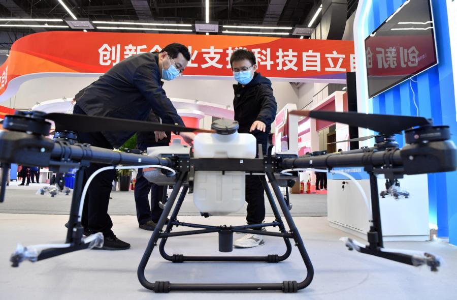 An agricultural drone at the main venue of the 2021 National Mass Innovation and Entrepreneurship Week. (Photo/Xinhua)