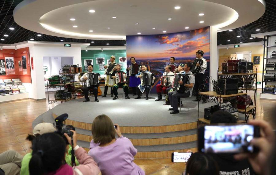 An accordion teacher performs as two artists dance along at Tacheng Accordion Museum in the Xinjiang Uygur autonomous region on Sept 24, 2021. (Photo: chinadaily.com.cn/Zou Hong)