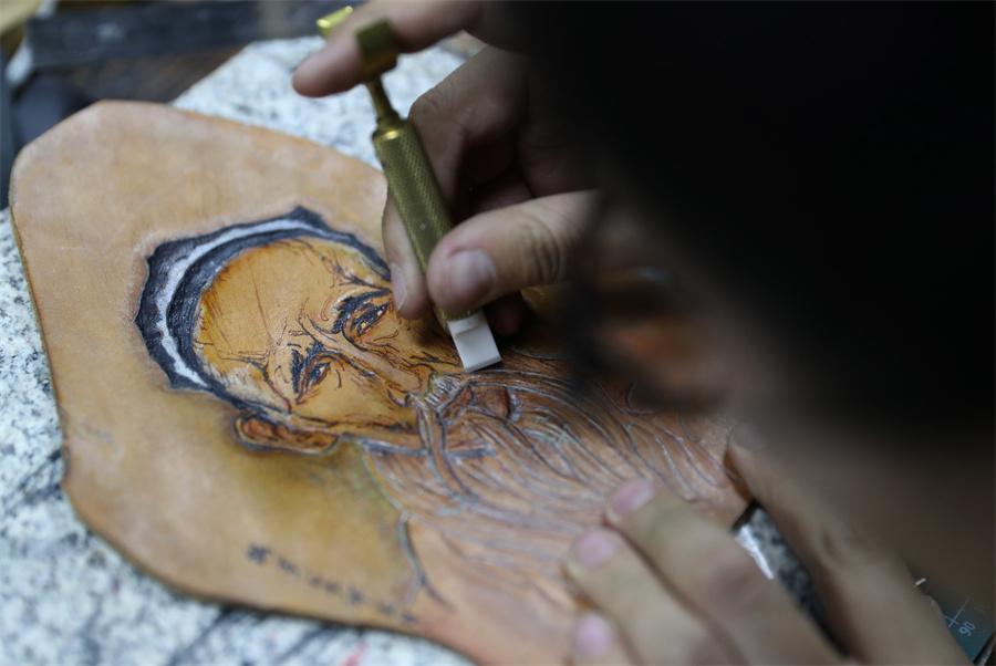 An artisan displays the traditional handcraft of leather carving in Yining city, Ili Kazak autonomous prefecture in Xinjiang, on Sept 29, 2021. (Photo: chinadaily.com.cn/Zou Hong)
