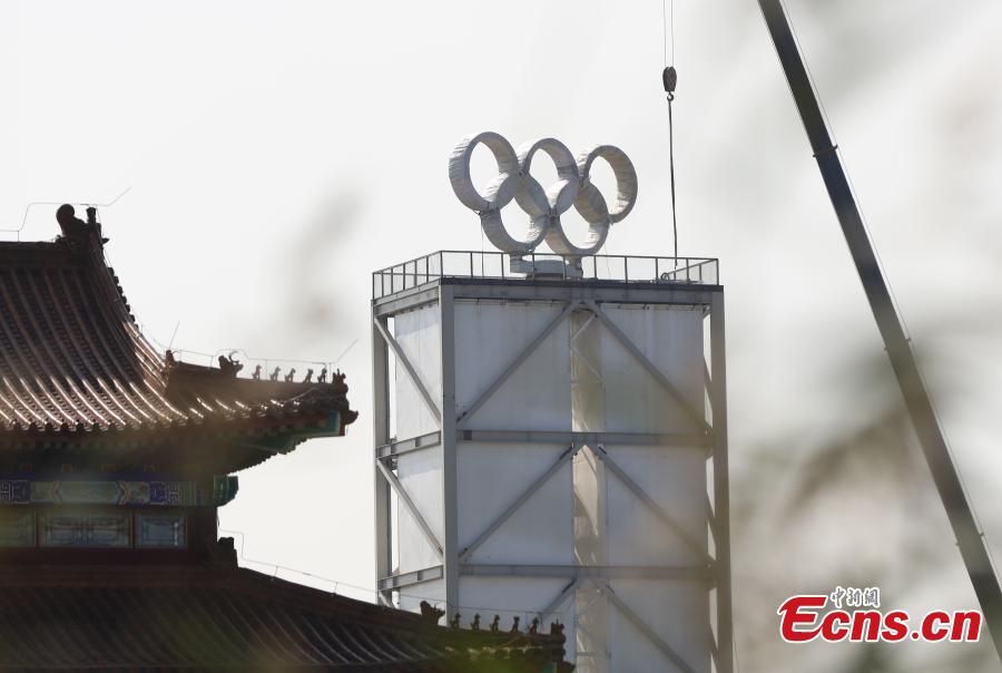 Workers install the Olympic rings at Shougang Park in Beijing, Oct. 20, 2021, Beijing. (Photo: China News Service/Sheng Jiapeng)