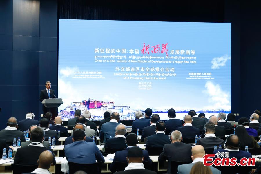 Chinese State Councilor and Foreign Minister Wang Yi delivers a speech at a foreign ministry event to introduce the Tibet Autonomous Region to the world in Beijing, Oct. 20, 2021. (Photo: China News Service/Han Haidan)