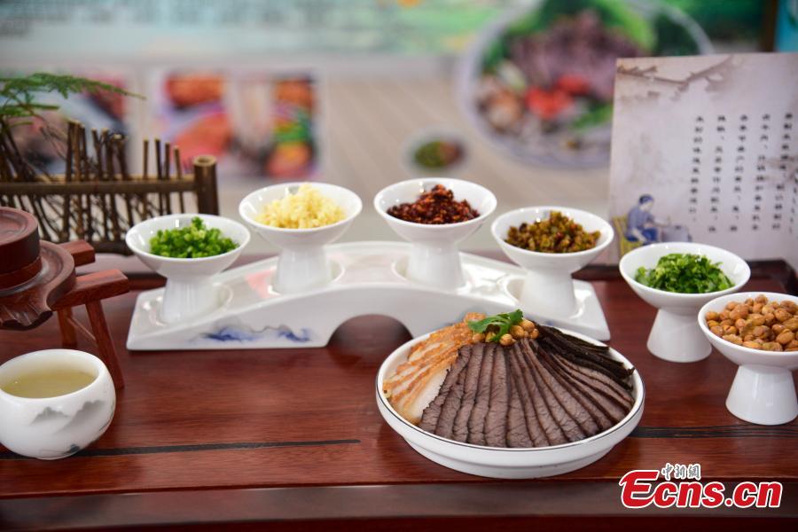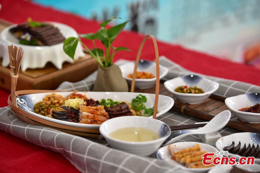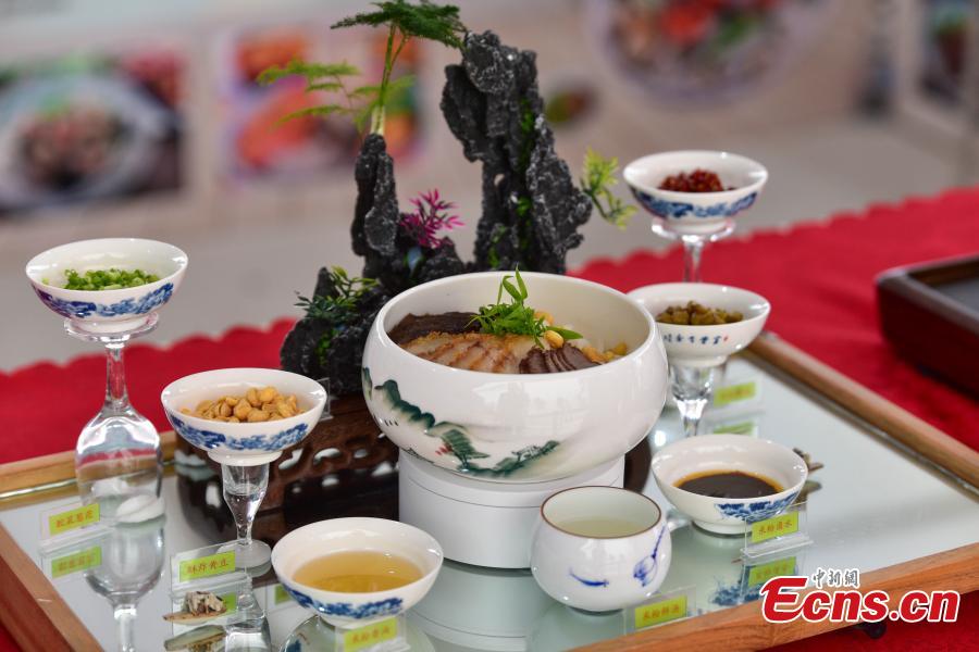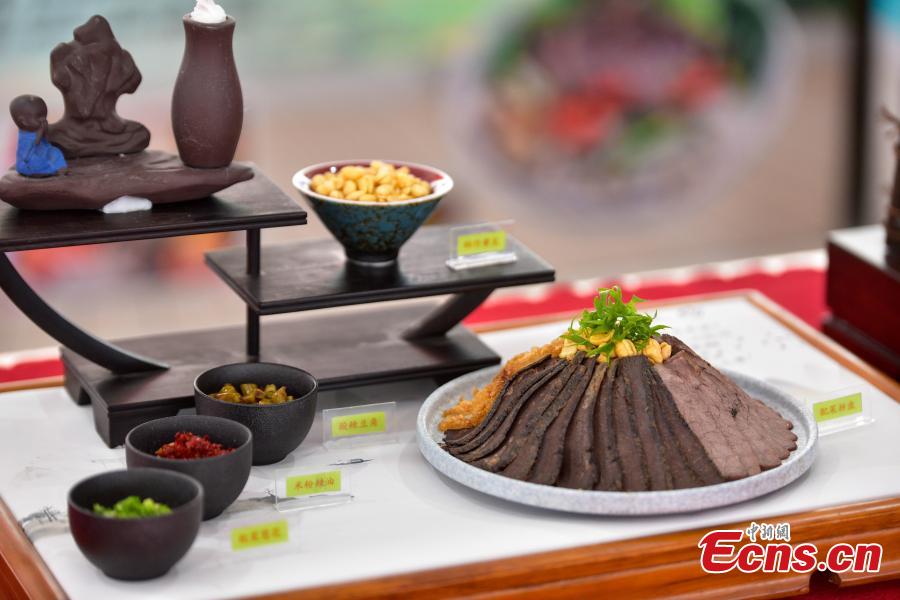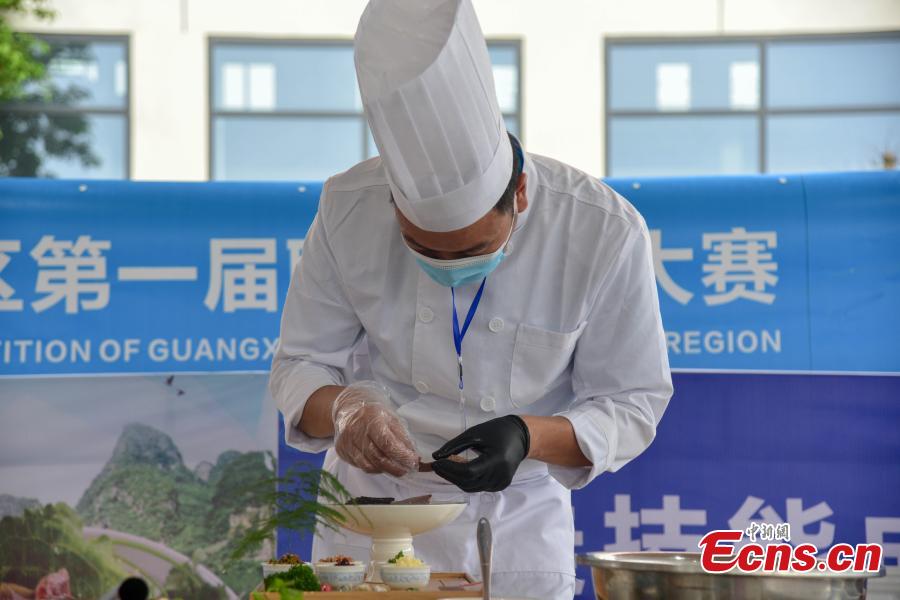 A competitor plates stewed meat at the First Vocational Skill Competition of Guangxi Zhuang Autonomous Region, in Liuzhou City, Oct. 20, 2021. (Photo: China News Service/Wang Yizhao)