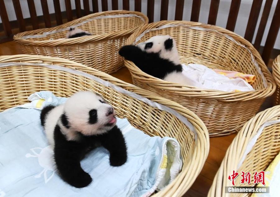 Six giant panda cubs rest in baskets at Shenshuping base of China Conservation and Research Center for the Giant Panda, Wolong National Nature Reserve, Sichuan Province, Oct. 20, 2021. (Photo: China News Service/An Yuan)