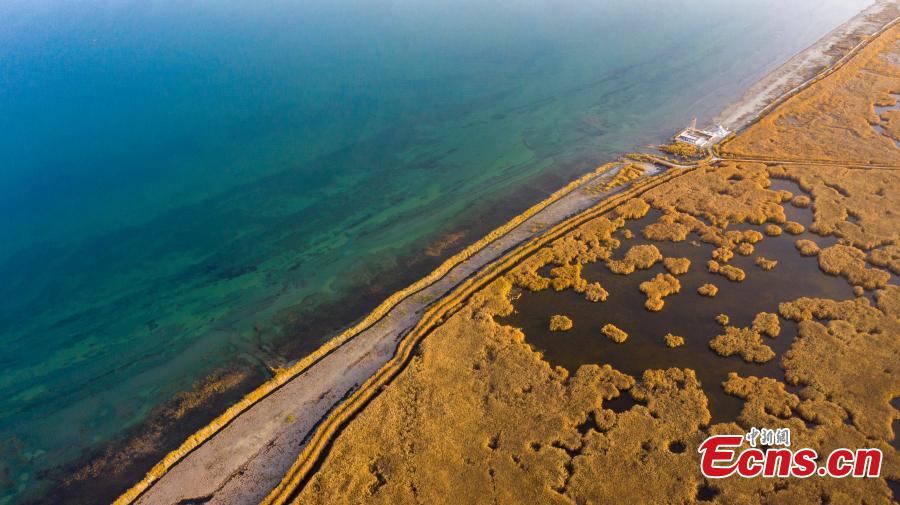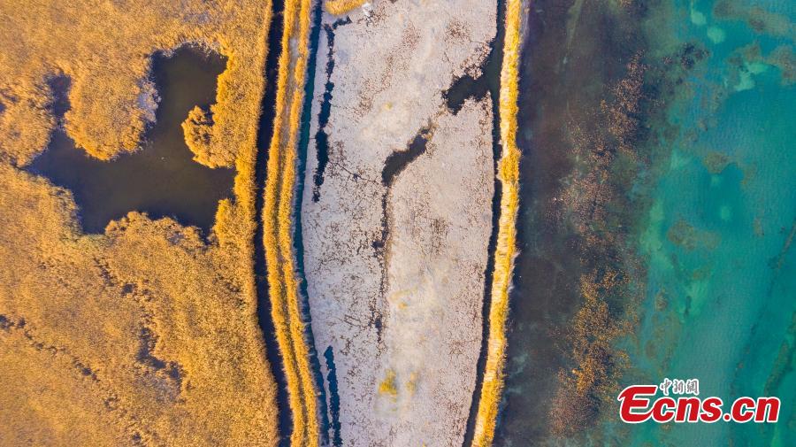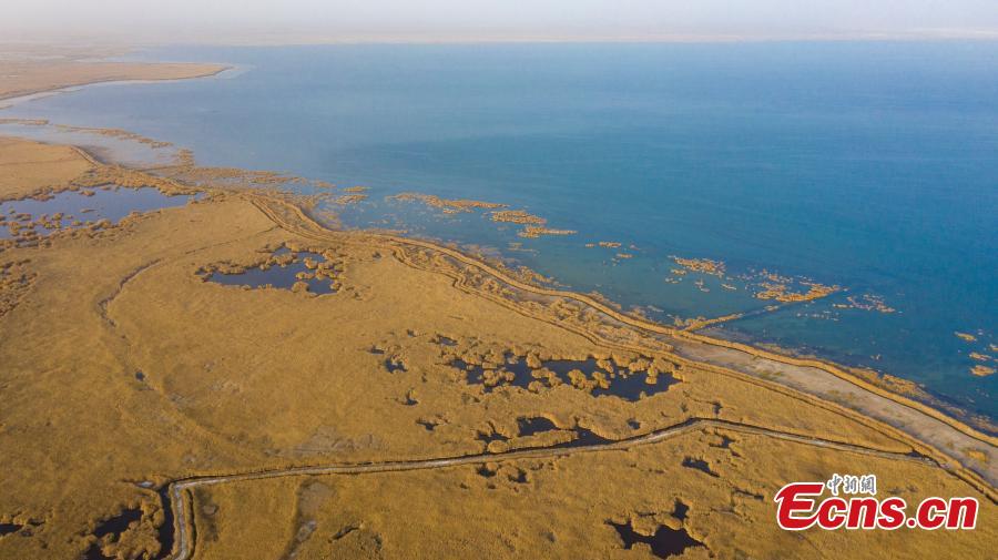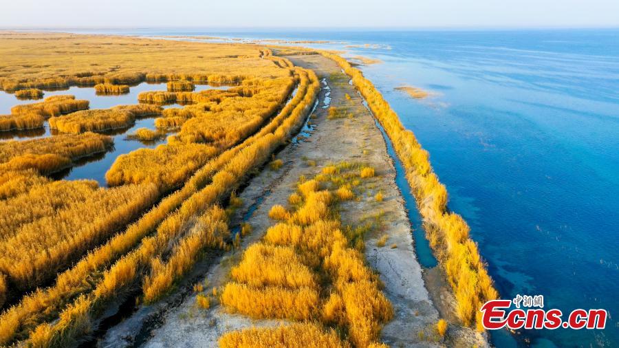 Aerial photo taken on Oct. 24, 2021 shows the autumn scenery of Bosten Lake wetland in Bayingolin Mongol Autonomous Prefecture of northwest China's Xinjiang Uygur Autonomous Region. (Photo: China News Service/Nian Lei)