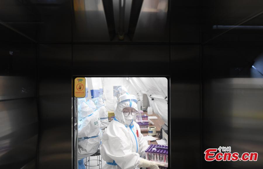 Medical workers conduct nucleic acid testing for COVID-19 at a "Falcon" air-inflated testing lab in Lanzhou, northwest China's Gansu Province, Oct. 25, 2021. (Photo: China News Service/Yang Yanmin)