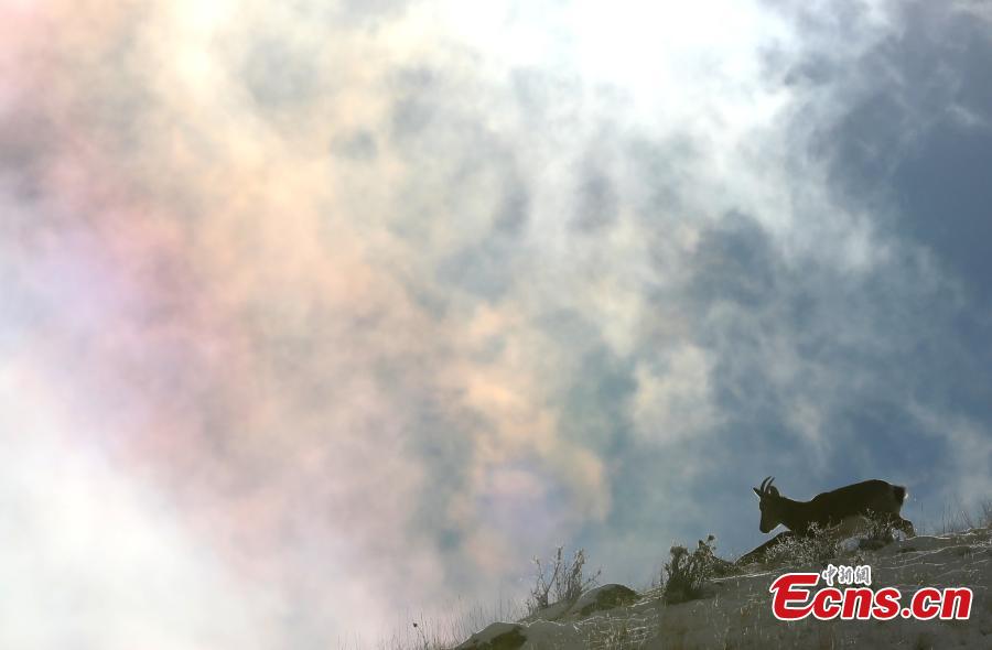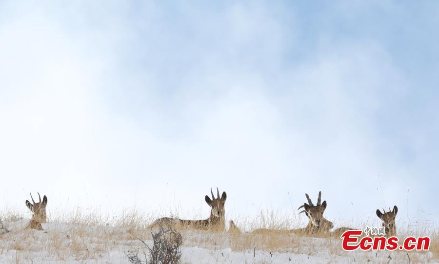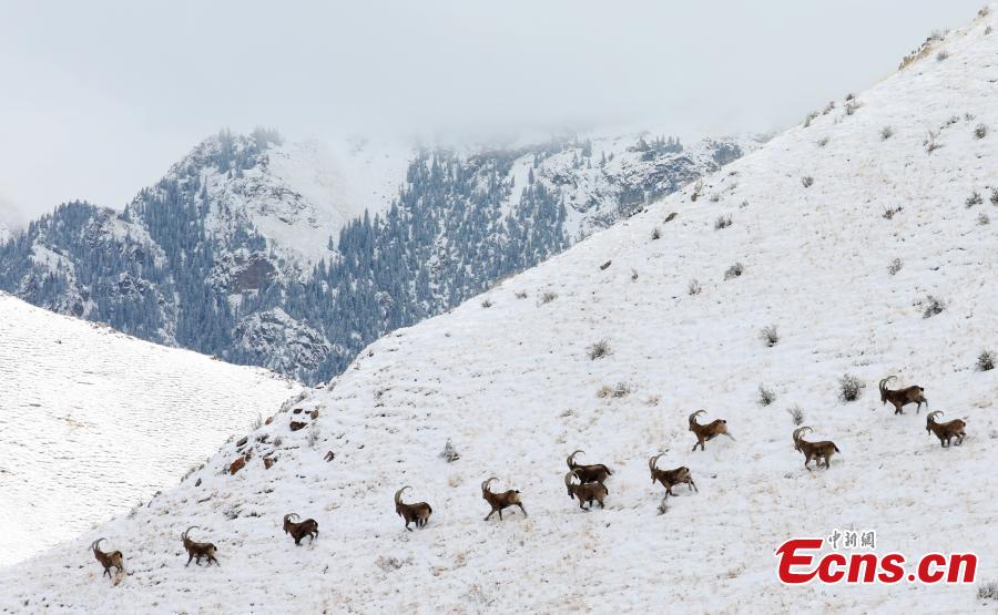 Flocks of Siberian ibex play in the snow in Bozhou, northwest China's Xinjiang Uygur Autonomous Region, Oct. 23, 2021. (Photo: China News Service/Shen Zhijun)