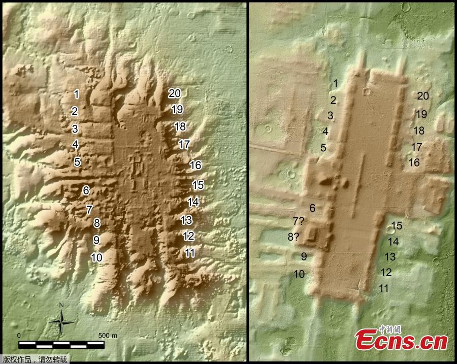 A lidar-based aerial view from June 2021 of the ancient Olmec site of San Lorenzo (left) in Mexico's Veracruz state and the Preclassic site of Aguada Fenix in Mexico's Tabasco state in the western Maya area, with newly identified structures numbered are seen in this handout image. (Photo/Agency)
