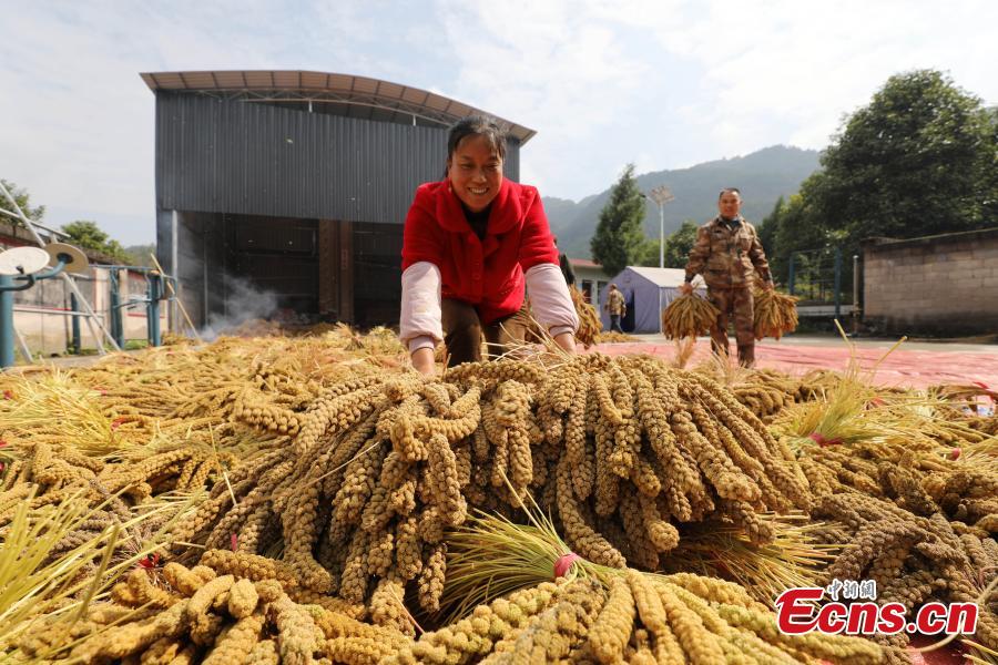 Villagers lay out millet after harvesting in Shuangcen village, Jiangkou County, Tongren City, Southwest China's Guizhou Province. (Photo: China News Service/Li He)