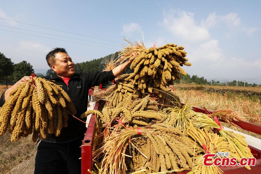 Villagers harvest millet in Shuangcen village, Jiangkou County, Tongren City, Southwest China's Guizhou Province. (Photo: China News Service/Li He)