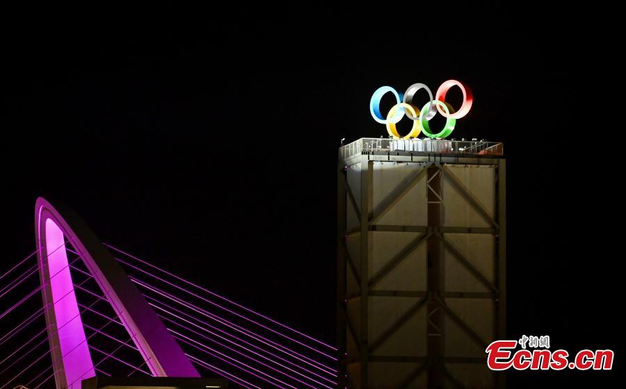 The Olympic rings at Shougang Park light up in Beijing, capital of China, on the evening of October 26, 2021. (Photo: China News Service/Zhang Xinglong)