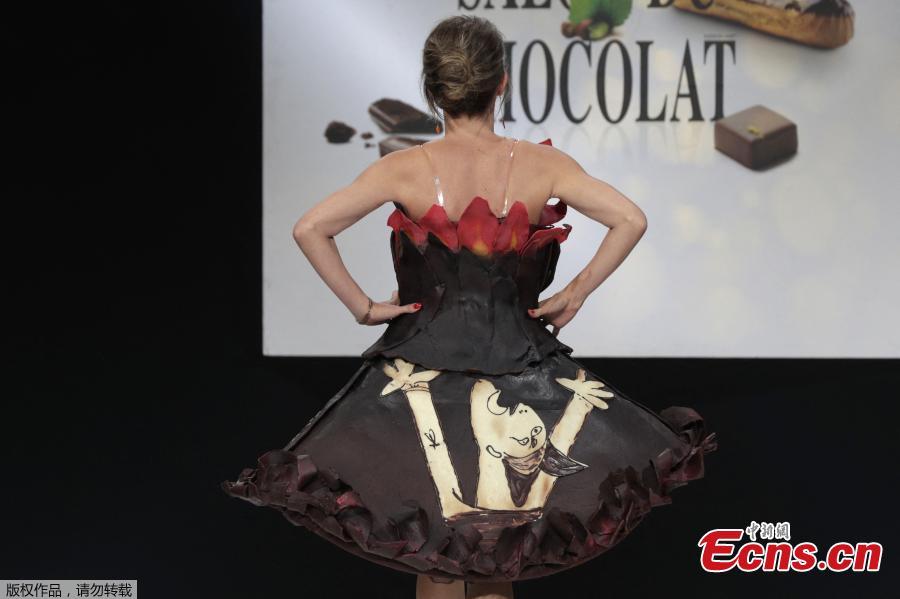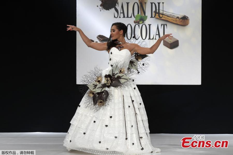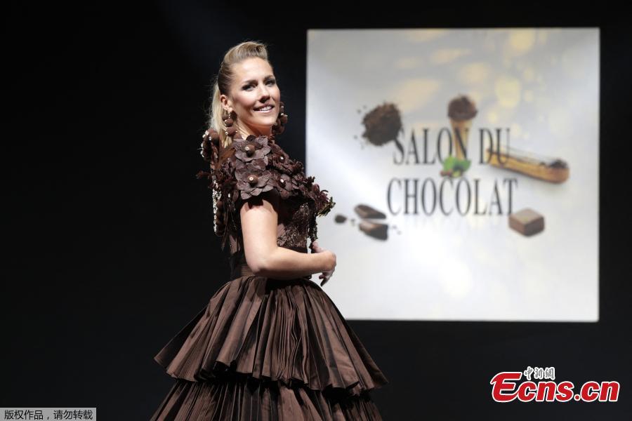 French TV host Yasmine Oughlis presents a creation made with chocolate during the Chocolate Fair in Paris, France, Oct. 27, 2021. (Photo/Agency)