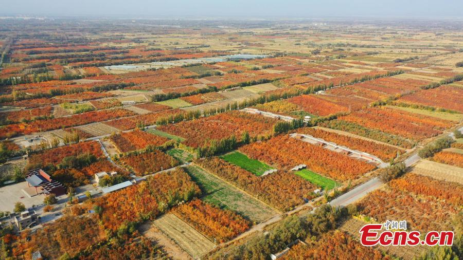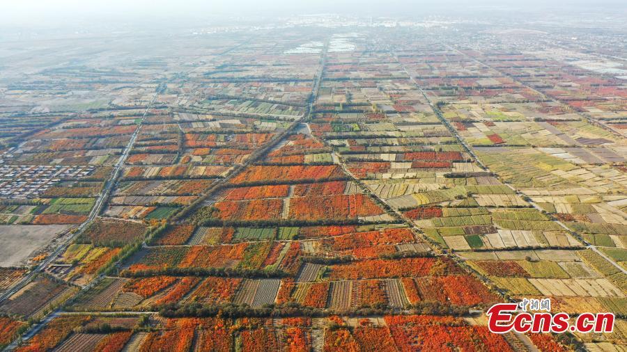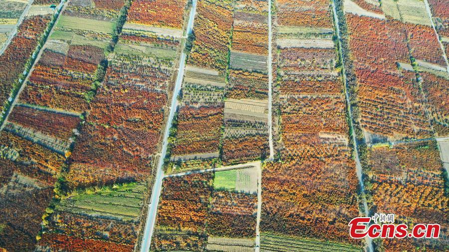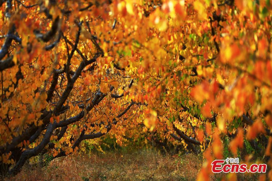 Apricot tree leaves change color during the late autumn in Nanhu Village, Xiazhen Town, Toksun County, Northwest China's Xinjiang Uygur Autonomous Region. (Photo: China News Service/Liu Yanmin)