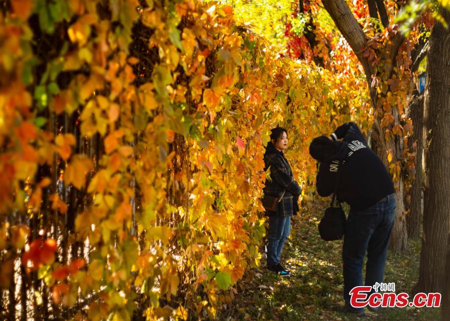 Citizens of Beijing wander take photos at the river bank in Haidian District, Beijing, Oct.31, 2021. (Photo: China News service/Hou Yu)