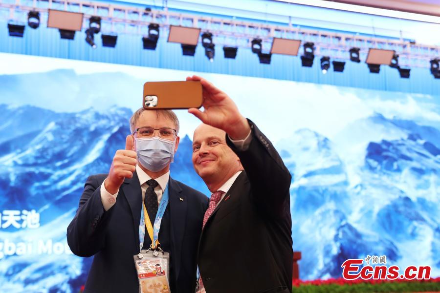 Foreign guests selfie in the conference room before the opening ceremony of the 4th China International Import Expo (CIIE) in Shanghai, Nov.4, 2021. (Photo: China News Service/Zhang Hengwei)