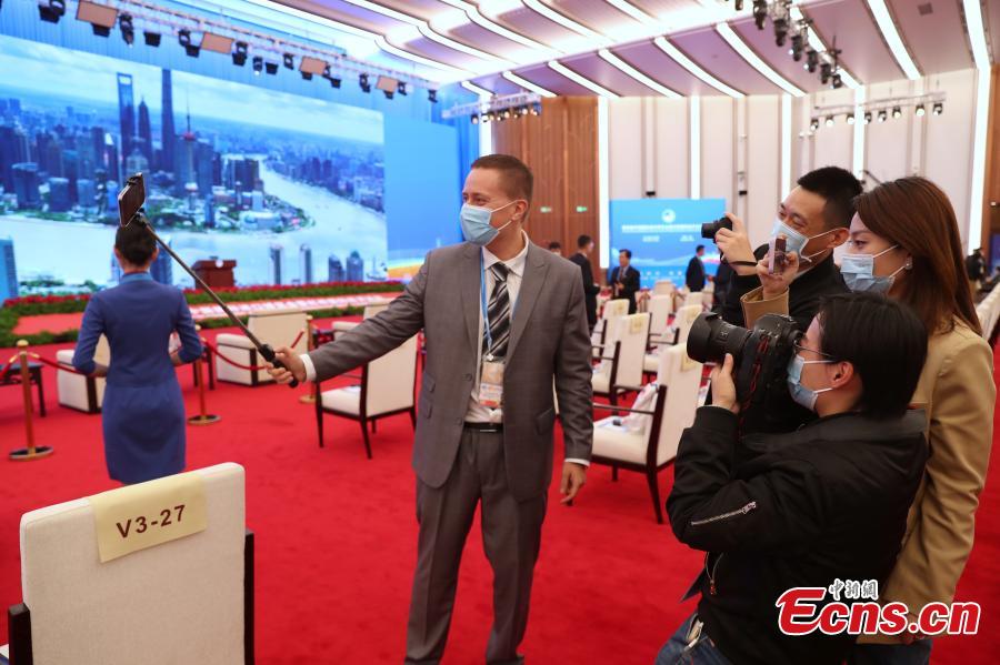 Foreign guests take photos with reporters on the opening ceremony of the 4th CIIE in Shanghai, Nov.4, 2021. (Photo: China News Service/Zhang Hengwei)