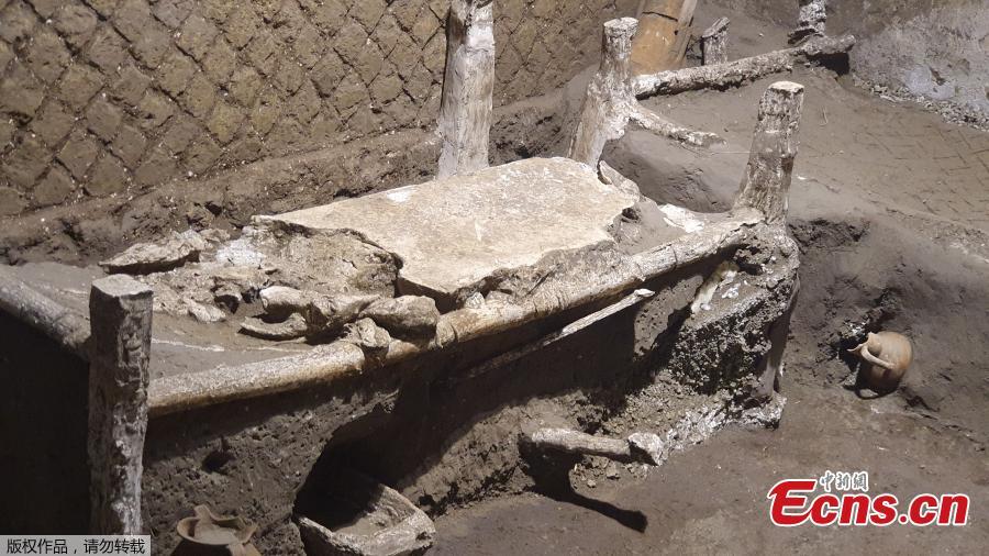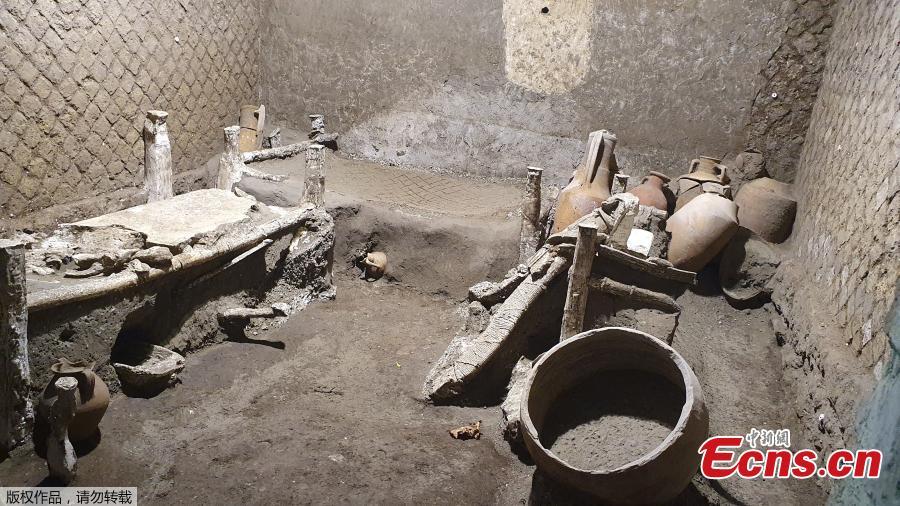 Photo released on Nov.7, 2021, shows a "slaves room" at a Roman villa, containing beds, amphorae, ceramic pitchers and a chamber pot is discovered in a dig near the ancient Roman city of Pompeii, destroyed in 79 AD in volcanic eruption. (Photo/Agencies)