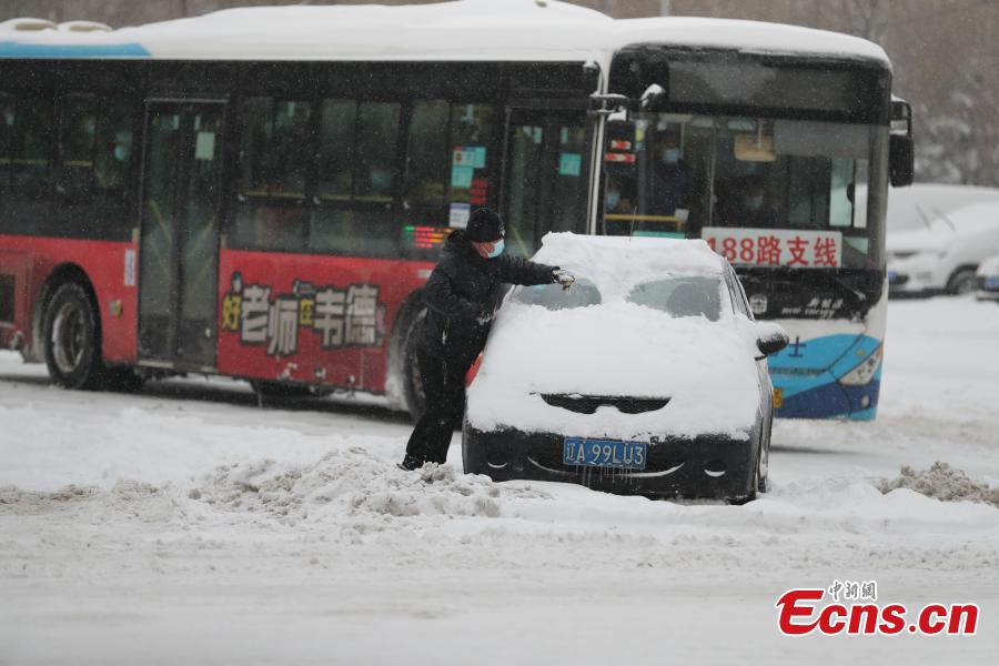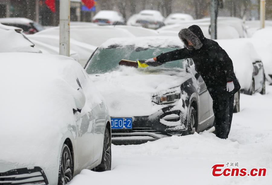 A man clears snow from his car in Shenyang, Liaoning Province, Nov. 8, 2021. (Photo/Yu Haiyang)