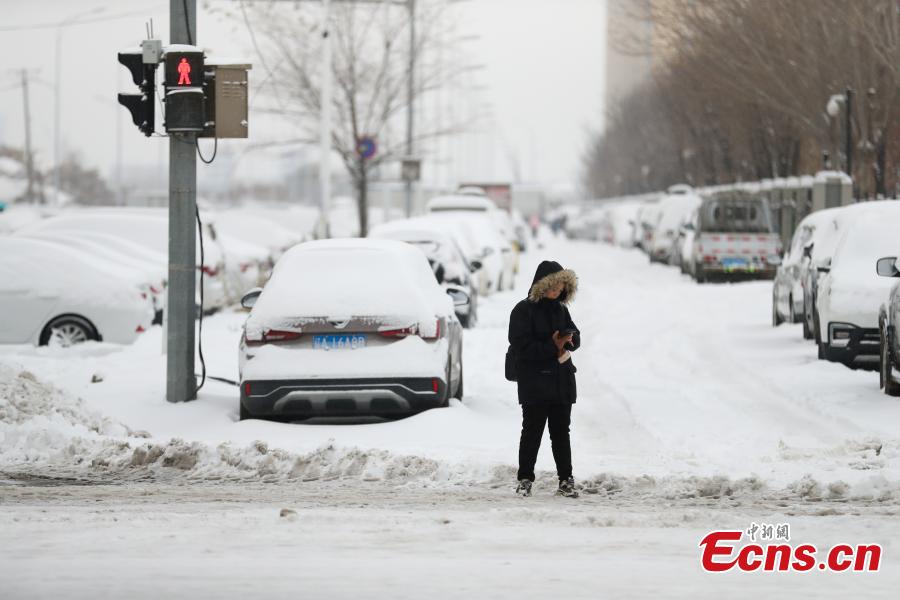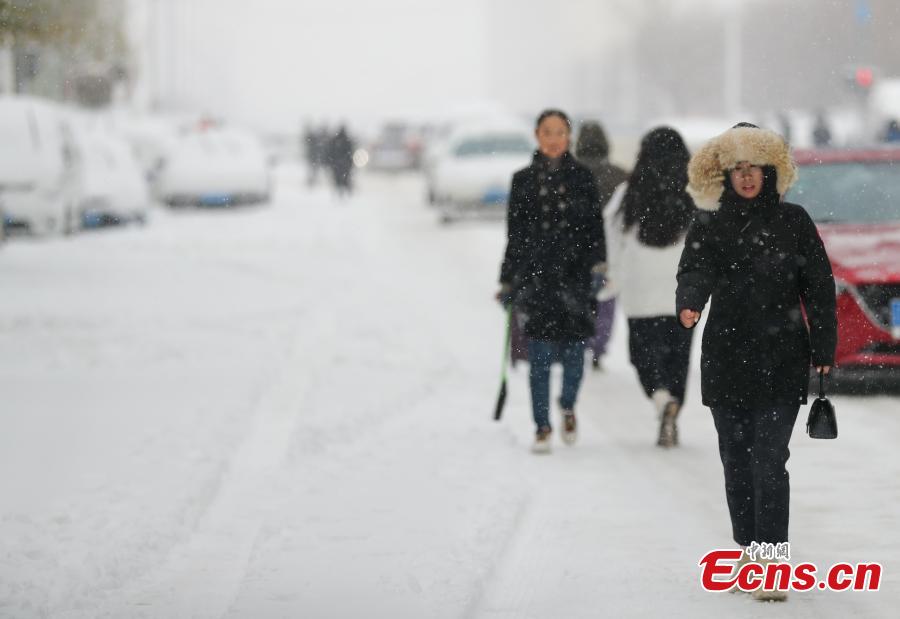 Heavy snowfall swept Shenyang City on Saturday and brought low temperatures here. People walked amid the snow.