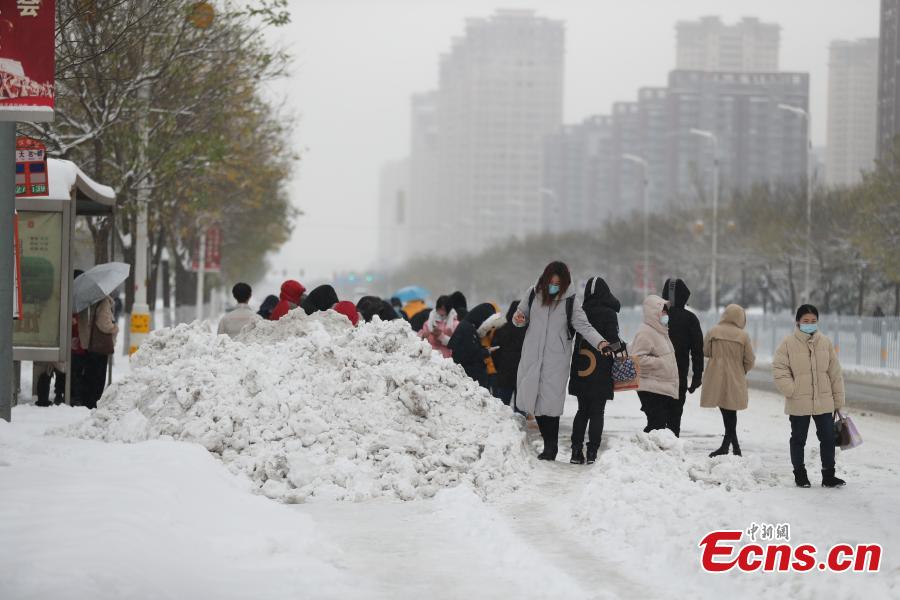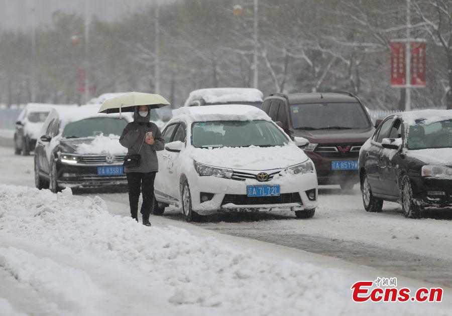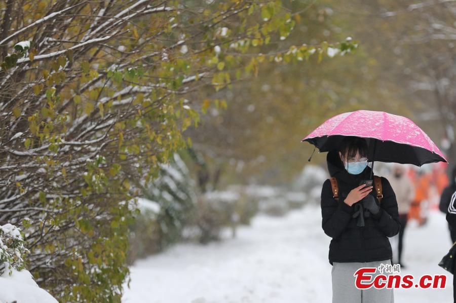 People walk on the snow in Shenyang, Liaoning Province, Nov. 8, 2021. (Photo/Yu Haiyang)