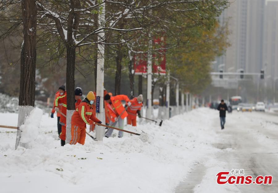 Sanitation workers sweep snow on a street in Shenyang, Liaoning Province, Nov. 8, 2021. (Photo/Yu Haiyang)