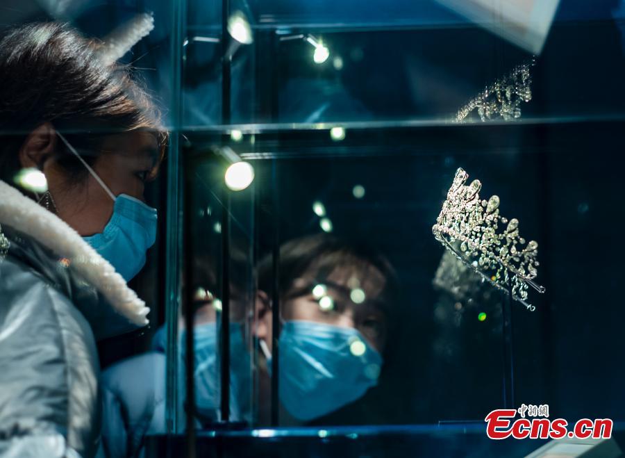 A woman looks at the “Crown of Bourbon Parma” at the "Crown Dream" jewelry exhibition held in The Red, Sanlitun, Beijing, Nov. 8, 2021. (Photo: China News Service/Hou Yu)