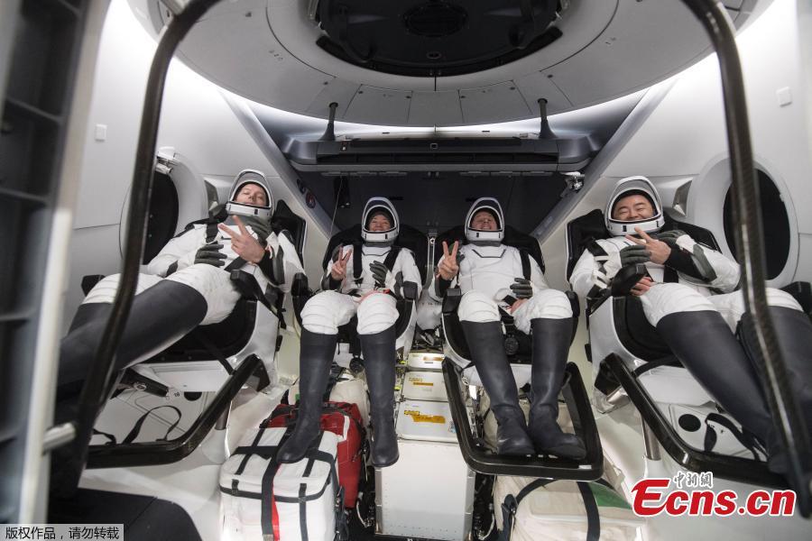 This NASA handout photo shows (fromL) ESA (European Space Agency) astronaut Thomas Pesquet, NASA astronauts Megan McArthur and Shane Kimbrough, and Japan Aerospace Exploration Agency (JAXA) astronaut Aki Hoshide, inside the SpaceX Crew Dragon Endeavour spacecraft onboard the SpaceX GO Navigator recovery ship shortly after having landed in the Gulf of Mexico off the coast of Pensacola, Florida, Nov. 8, 2021. (Photo/Agencies)