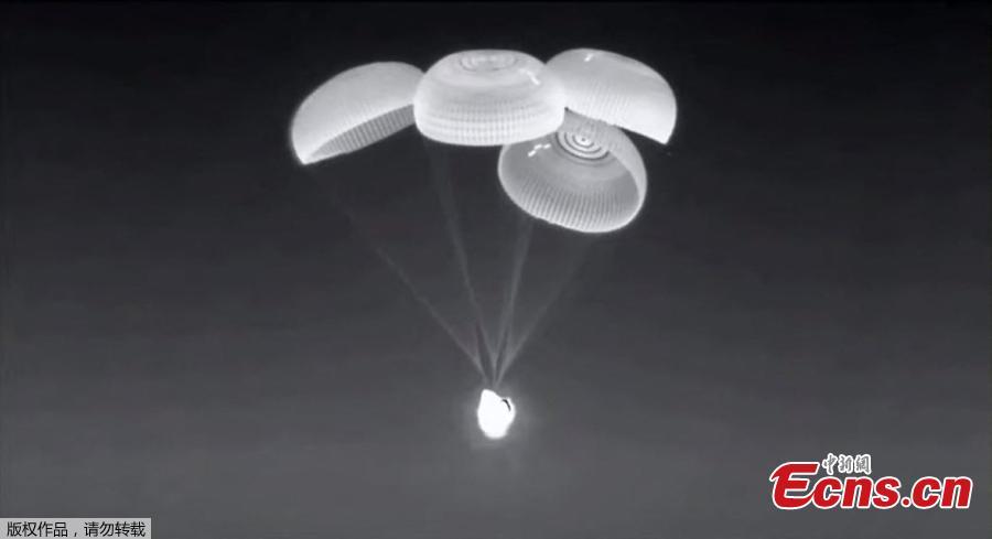 This screen grab taken from the SpaceX live webcast shows the Crew-2 SpaceX Dragon capsule dubbed "Endeavour" with its parachutes deployed as it splashes down off the coast of Pensacola, Florida, Nov. 8, 2021. (Photo/Agencies)