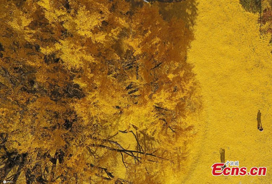 Leaves of an 800-year-old ginkgo tree in Wonju-si City, South Korea, fall on the ground, looking like a golden carpet, Nov. 11, 2021. (Photo/IC)