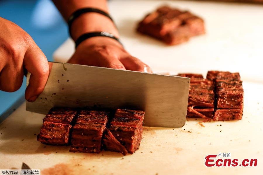 A chef cuts a 3D printed plant-based steak mimicking beef, produced by Israeli start-up Redefine Meat as part of an event marking the international commercial launch of its New-Meat product range in a restaurant in Tel Aviv, Israel, Nov. 15, 2021. (Photo/Agencies)