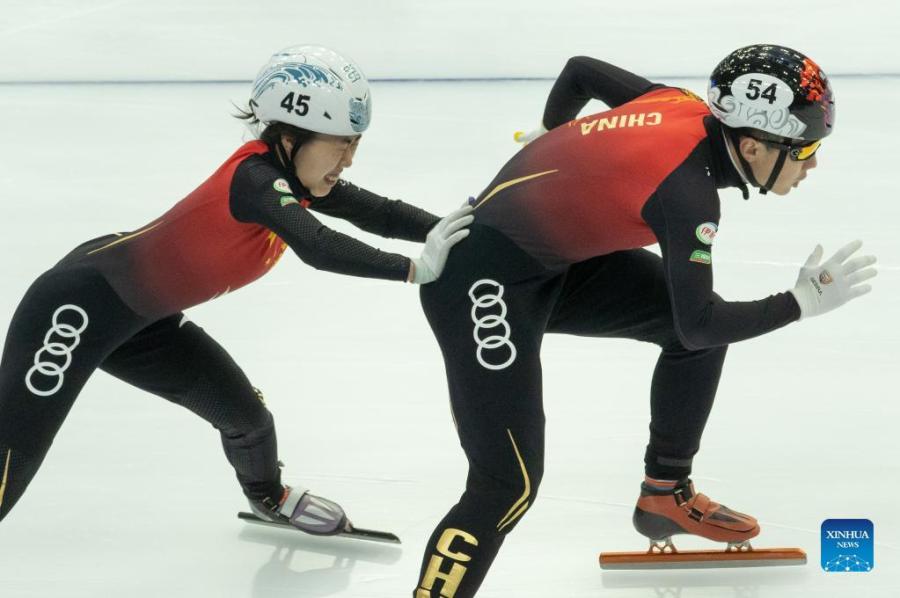 Zhang Yuting (L) of China pushes her teammate Ren Ziwei (R) as they compete in the Mixed 2000 m Relay Final during the ISU World Cup Short Track Speed Skating series in Debrecen, Hungary on Nov. 21, 2021. (Xinhua/Attila Volgyi)