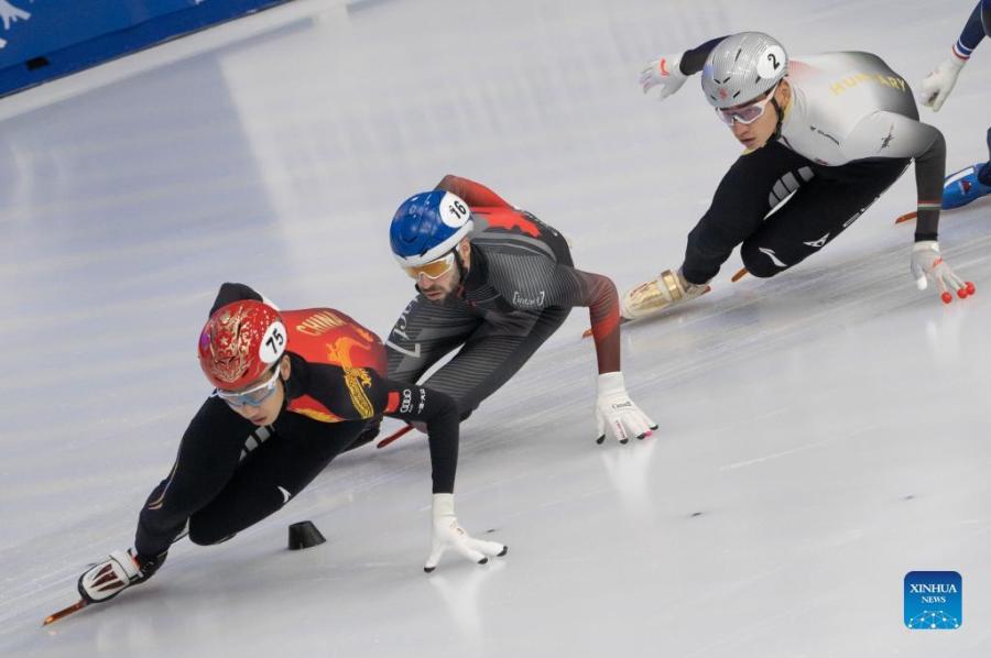 Sun Long (L) of China leads in the Mixed 2000 m Relay Final during the ISU World Cup Short Track Speed Skating series in Debrecen, Hungary on Nov. 21, 2021.(Xinhua/Attila Volgyi)