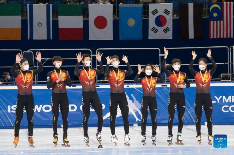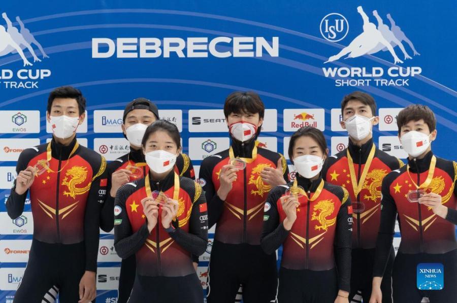 Members of Team China celebrate during the awarding ceremony after the Mixed 2000 m Relay Final during the ISU World Cup Short Track Speed Skating series in Debrecen, Hungary on Nov. 21, 2021. (Xinhua/Attila Volgyi)