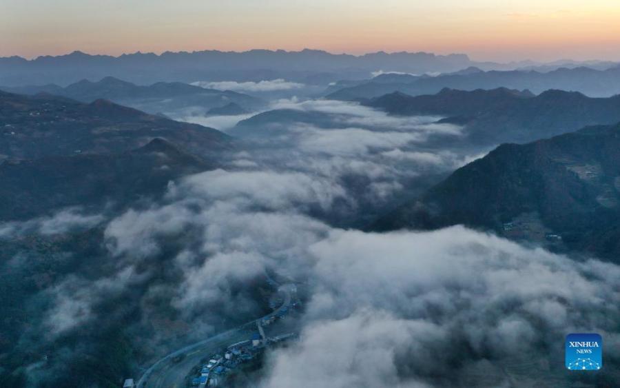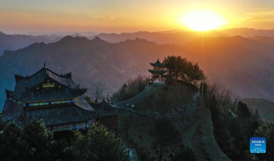 Aerial photo taken Nov. 23, 2021 shows the scenery of Miaoshanzhai scenic area in Baihe County, northwest China's Shaanxi Province. (Xinhua/Tao Ming)