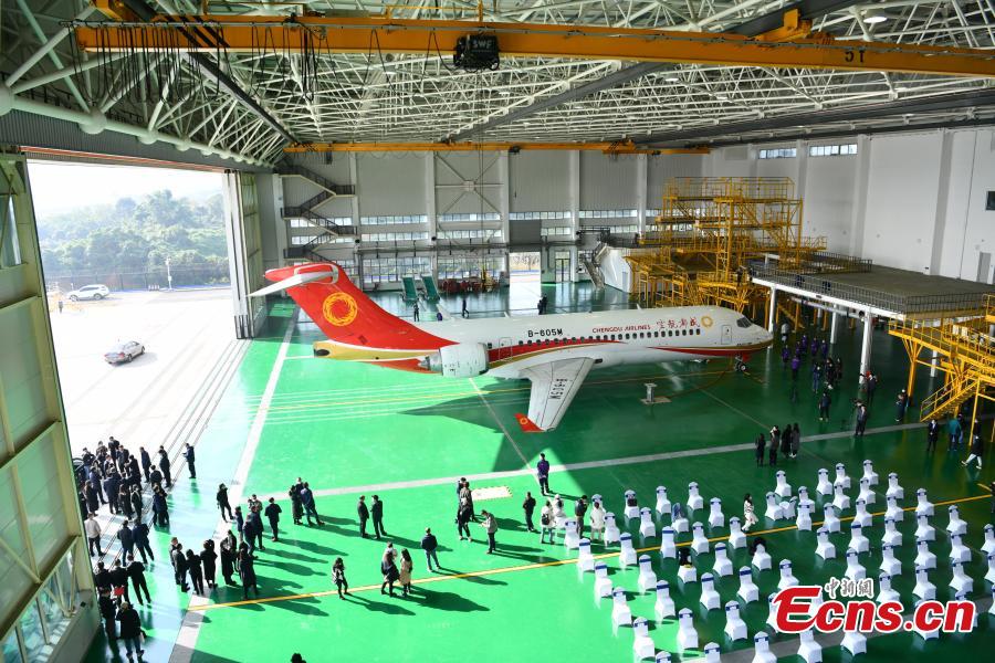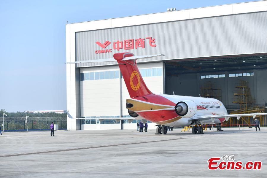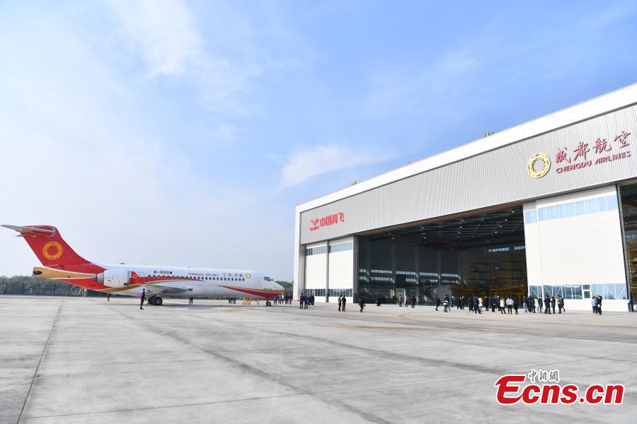An ARJ21 aircraft of Chengdu Airlines glides in the maintenance base for domestically-produced civil aircraft of Commercial Aircraft Corporation of China (COMAC) in Chengdu, southwest China's Sichuan Province, Nov. 24, 2021. (Photo: China News Service/Zhang Lang)
