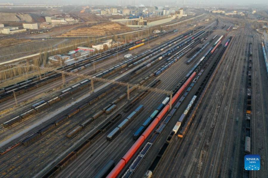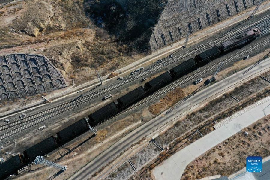 Aerial photo taken on Nov. 23, 2021 shows a view of the Baotou west station, where up to 30,000 tonnes of coal is loaded to trains every day, in north China's Inner Mongolia Autonomous Region. North China's Inner Mongolia Autonomous Region has made enormous efforts to ensure the supply of coal across the country, as coal consumption saw a surge in early winter. China Railway Hohhot Group Co., Ltd. has also been mobilized in various ways to ensure the transportation of coal for power generation and heating this winter and next spring. (Xinhua/Zhu Wenzhe)