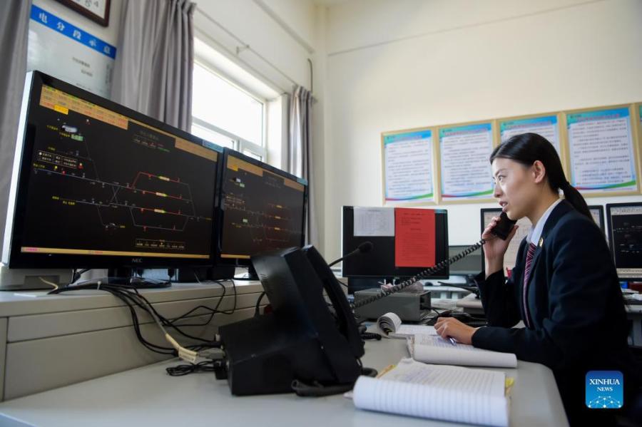 A staff member maneuvers coal-carrying trains at a loading station of a coal mine in Erdos, north China's Inner Mongolia Autonomous Region, Nov. 23, 2021. North China's Inner Mongolia Autonomous Region has made enormous efforts to ensure the supply of coal across the country, as coal consumption saw a surge in early winter. China Railway Hohhot Group Co., Ltd. has also been mobilized in various ways to ensure the transportation of coal for power generation and heating this winter and next spring. (Xinhua/Zhu Wenzhe)