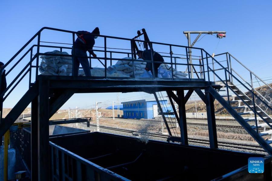Staff members spread frost-proof powder into a train carriage before loading at a loading station of a coal mine in Erdos, north China's Inner Mongolia Autonomous Region, Nov. 23, 2021. North China's Inner Mongolia Autonomous Region has made enormous efforts to ensure the supply of coal across the country, as coal consumption saw a surge in early winter. China Railway Hohhot Group Co., Ltd. has also been mobilized in various ways to ensure the transportation of coal for power generation and heating this winter and next spring. (Xinhua/Li Zhipeng)